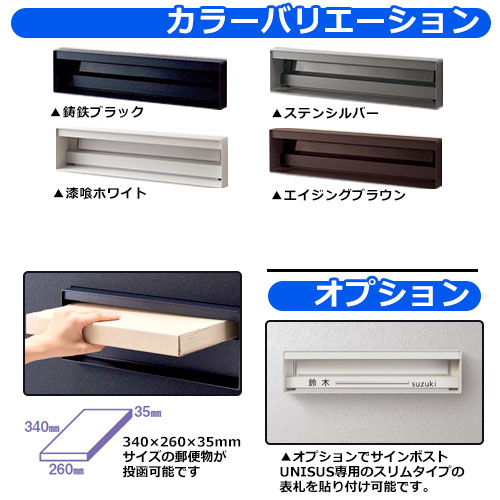 ワンポイント付表札のオーダーはこちらから ワンポイント無表札のオーダーはこちらから UNISUSの埋め込み施工についてご注意 UNISUS口金タイプのオプション 表札ワンポイント付 表札ワンポイント無 ポール取付部材 口金タイプ化粧パネル 据置き台座 フェンス取り付け金具 ダイヤル錠 ポスト内LEDライト