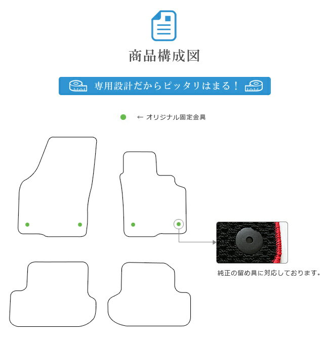 適合車種 VW フォルクスワーゲン ザ ビートル Volkswagen THE Beetle年式:2012年(平成24年)4月〜現行モデル型式:16CBZ 部位 フロア(運転席・助手席・後部座席) 商品構成 専用フロアマット4枚(運転席1枚 助手席1枚 後部座席2枚)