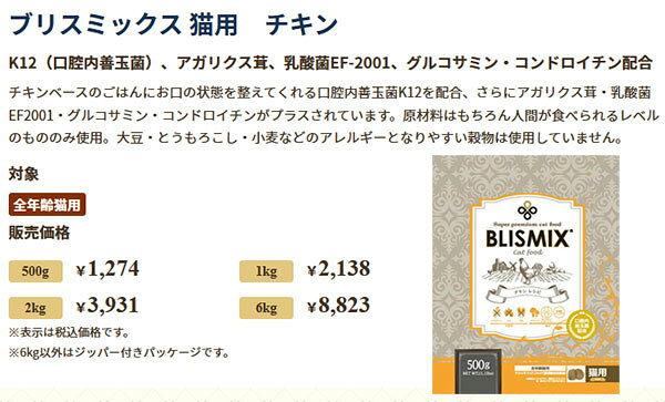 ブリスミックス 猫用 チキン 500g 4589602260105 【全年齢 全猫種 キャットフード ドライ 猫用 チキン アーテミス K12(口腔内善玉菌) アガリクス茸 乳酸菌EF-2001 グルコサミン・コンドロイチン配合】【ポイント0604】