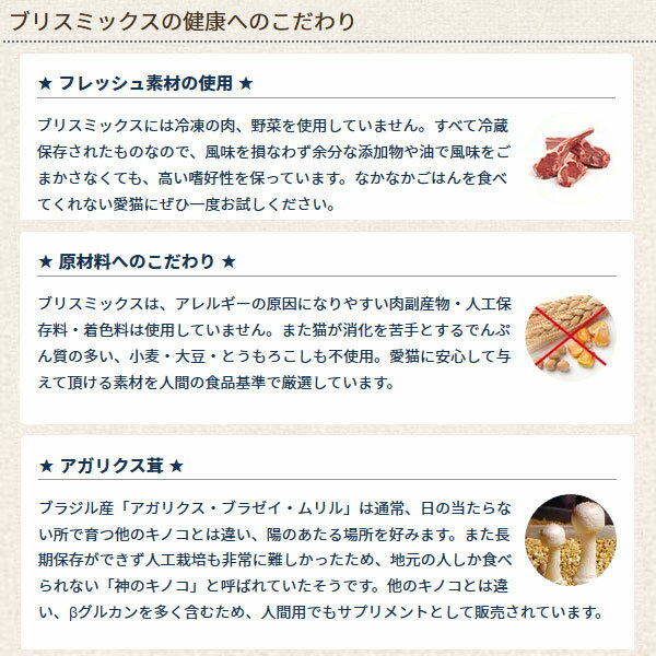 原材料へのこだわり ブリスミックスは、アレルギーの原因になりやすい肉副産物・人工保存料・着色料は使用していません。