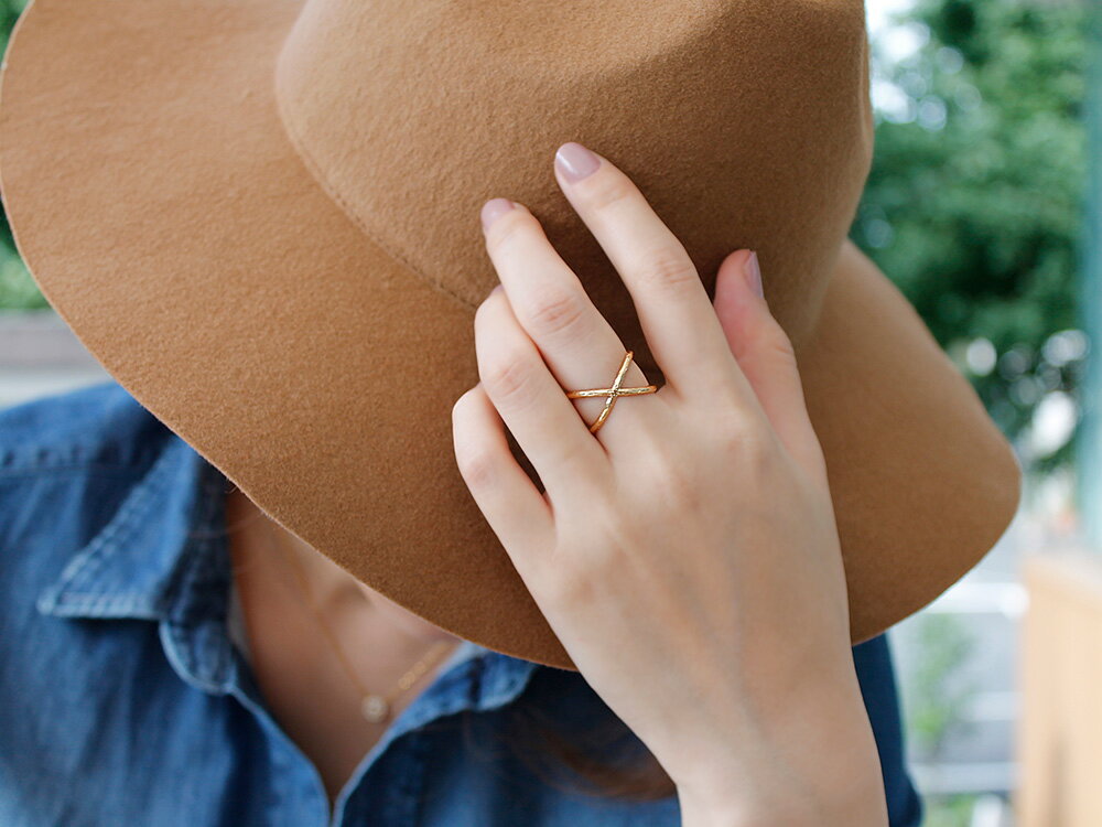 かなりインパクトのあるかたちが目に飛び込んでくるリングは洗練された「X」デザイン。